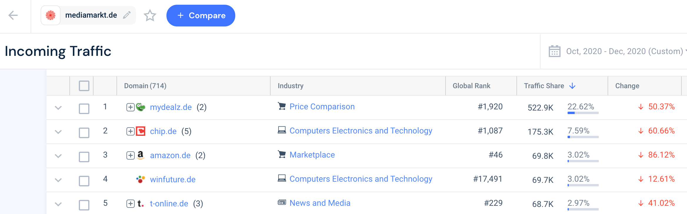 Sie können Similarweb Digital Marketing Intelligence wirksam dabei einsetzen, passende Affiliates für Ihre Marke zu finden, indem Sie die Kennzahlen zur Website – Performance der verschiedenen Display Publisher und Referral Websites dazu analysieren. Ebenfalls können Sie relevante Websites miteinander vergleichen und diejenigen mit dem höchsten Traffic – Volumen identifizieren, um den Kontakt hinsichtlich einer Zusammenarbeit vor Black Friday einzuleiten.