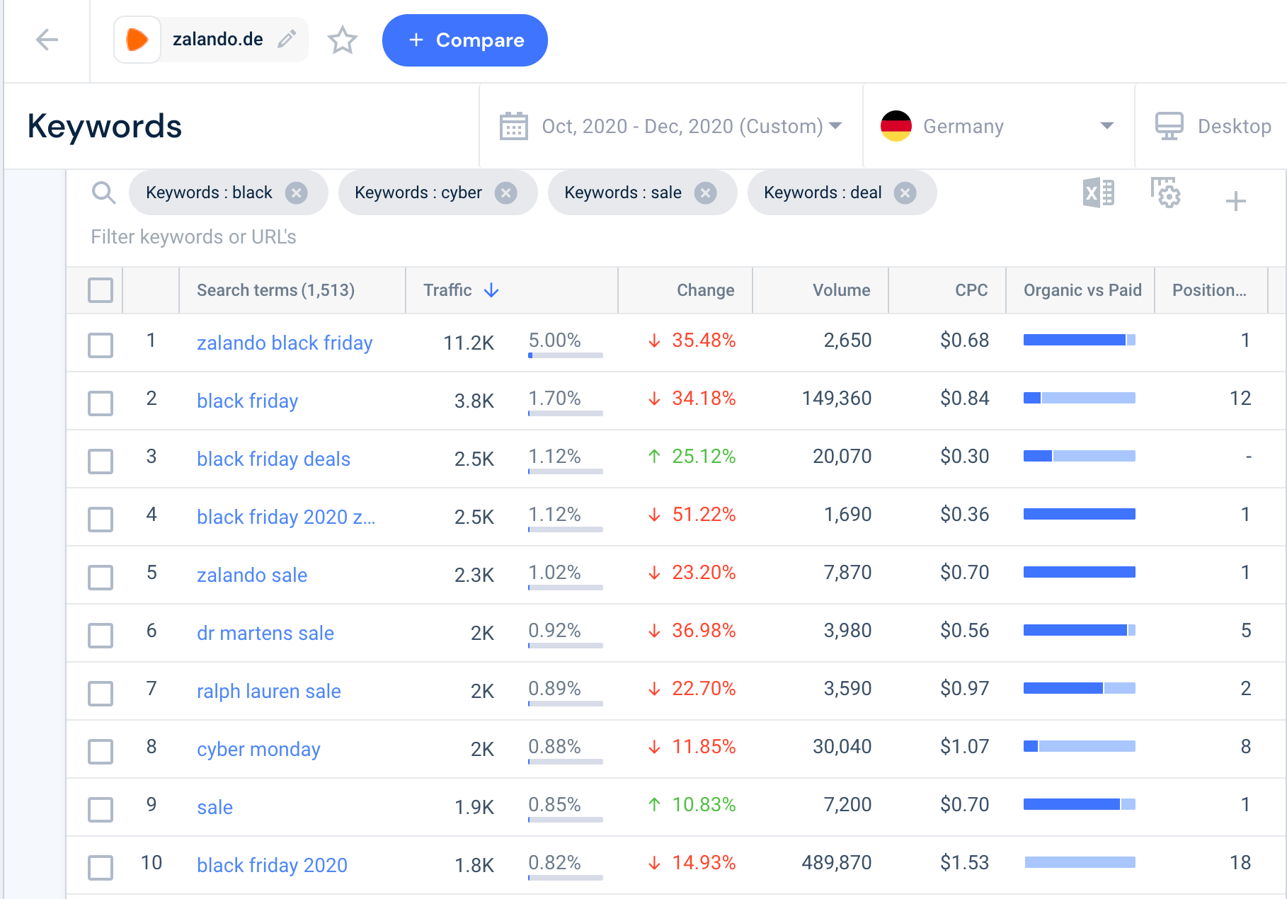 Ein Blick auf zalandos Paid Keywords in Q4 2020 zeigt, dass ein erheblicher Anteil an Besucherstrom durch Suchbegriffe wie ‘zalando black friday’, ‘black friday deals’, ‘zalando sale’ generiert wird.