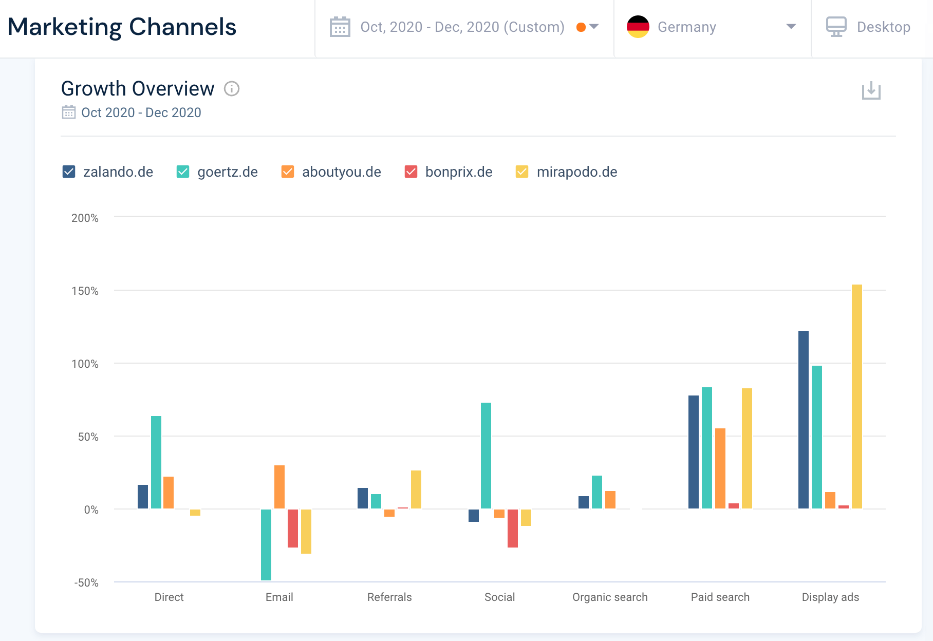 Similarweb gibt Ihnen ein Verständnis darüber, wie verschiedene Marketingkanäle eingesetzt werden müssen, um eine erfolgreiche Marketingstrategie zu erstellen und wie der Zugang zu Daten hinsichtlich ganzjährigen sowie saisonale Markttrends zu Ihrem Vorteil genutzt werden können.