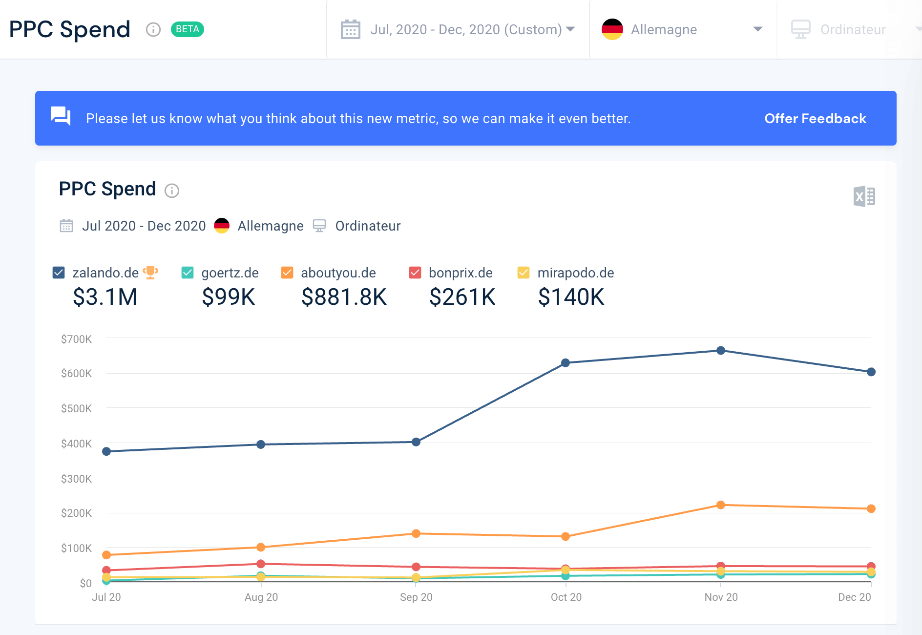 Lassen Sie uns nachsehen woher das starke Wachstum herkommt, indem wir die PPC Ausgaben in Q3 2020 und Q4 2020 betrachten. Man erkennt, dass zalando.de das Budget um 56% von $ 402 Tsd im September 2020 auf $ 629 Tsd im Oktober 2020 erhöht hat, was den Anstieg in Paid Search Traffic ausmacht. Im Fall von mirapodo.de haben sich die PPC Ausgaben im gleichen Zeitraum sogar um 157% erhöht.