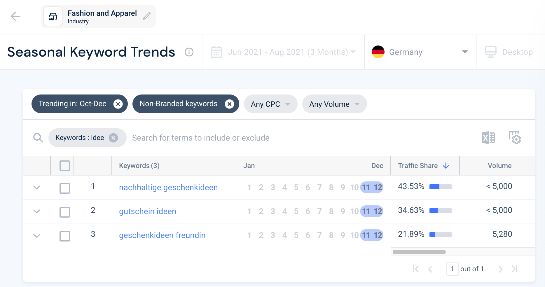 Um einen erfolgreichen Black Friday Keyword Plan zu entwerfen, brauchen Sie das richtige Werkzeug. Mit unserem Keyword Saisonalität Tool (‘Keyword Seasonality Tool’) können Sie nach den anvisierten Weihnachts – Suchbegriffen in Ihrem speziellen Markt suchen und ebenfalls herausfinden, welches das meiste EInflusspotential hat.