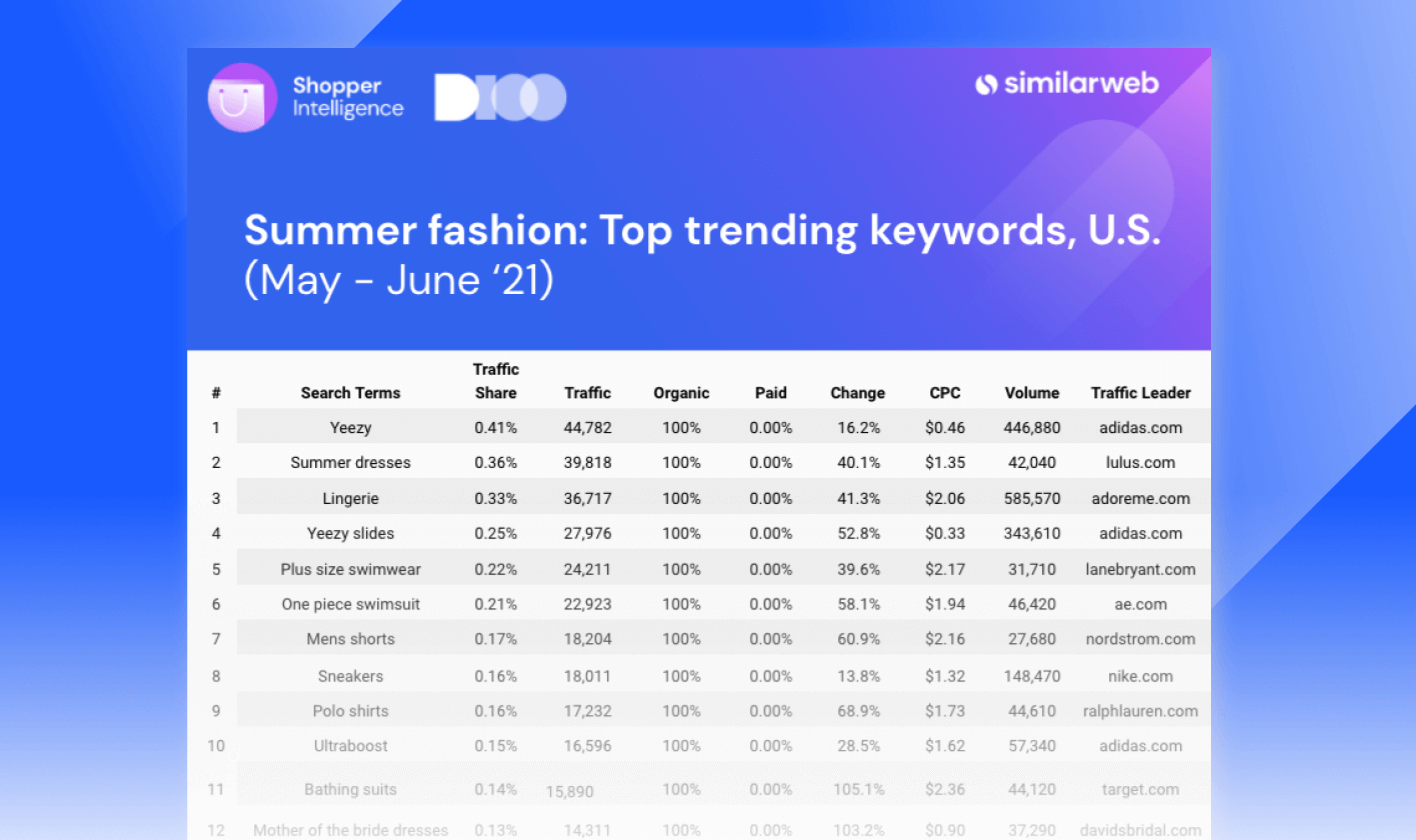 Between eased COVID restrictions and July 4th celebrations, Americans are eager to look their best again and make up for time lost in sweats last summer. This presents a challenge to retailers and brands trying to tailor their eCommerce strategies to consumer demand. To help, we’ll use Web Intelligence and analyze the top 25 trending keywords for the U.S. fashion and apparel industry (May-June 2021) that are driving summer 2021 fashion trends, the consumer behavior behind them, and retailers’ winning rankings.