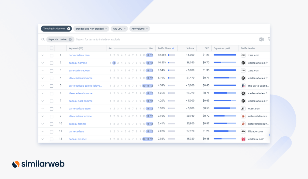Pour créer votre plan de mots-clés Black Friday prometteurs, vous avez besoin des bons outils. Avec notre outil de saisonnalité des mots-clés, recherchez vos mots-clés cibles et ceux de Noël au sein de votre marché pour voir ce qui a le plus d’impact potentiel.