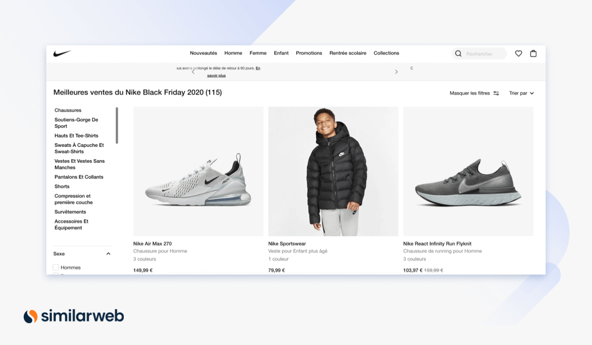Nous pouvons voir dans l’exemple ci-dessous une page nike.com créée spécifiquement pour vendre des baskets à prix réduit lors du Black Friday en 2020.