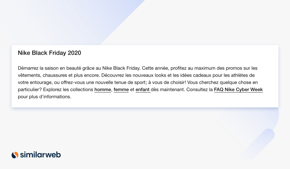 A la fin de la page, Nike inclut un paragraphe qui donne encore plus d’informations sur la Cyber Week, notamment une page FAQ spécifique pour cette période.