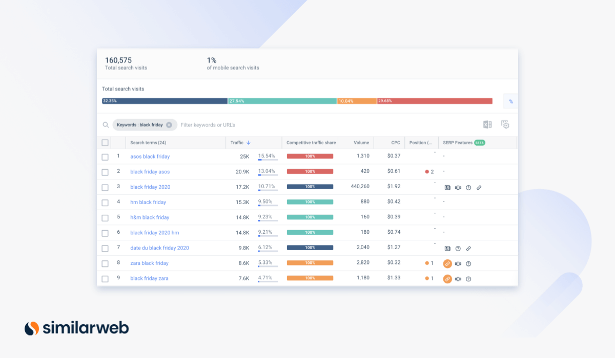 C’est le moment idéal pour transformer vos idées marketing dédiées au Black Friday en une stratégie à part entière. Afin de vous fournir des insights marketing révélateurs sur le Black Friday 2020, nous avons analysé les chiffres et les tendances à l’aide de la Digital Marketing Intelligence de Similarweb.