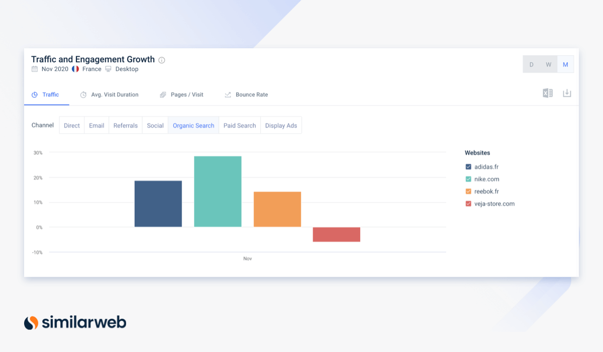 Dans l’analyse des canaux marketing, nous pouvons comparer le trafic de recherche organique de adidas.fr à celui de nike.com, reebok.fr et veja-store.com sur la période du Black Friday. Le résultat montre que Nike a la plus forte croissance de trafic organique (+30% entre octobre et novembre 2020).
