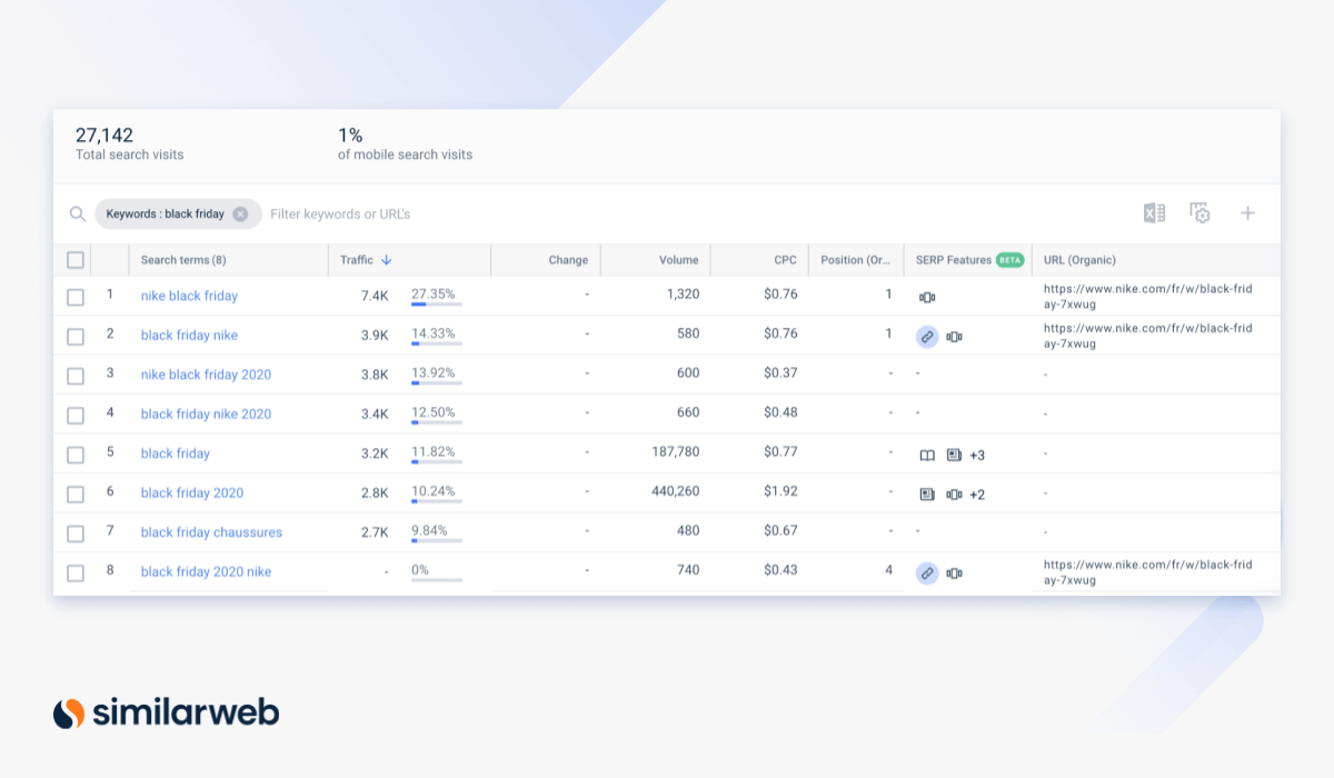 Analysons leur stratégie de mots-clés et voyons ce qu’ils ont ciblé pour obtenir ce gain de 30%. Les mots-clés citant le nom de la marque (Nike + black friday) sont ceux qui rapportent le plus de visites. Mais Nike est aussi présent sur des mots-clés au trafic élevé, comme “Black Friday” et “Black Friday 2020”.