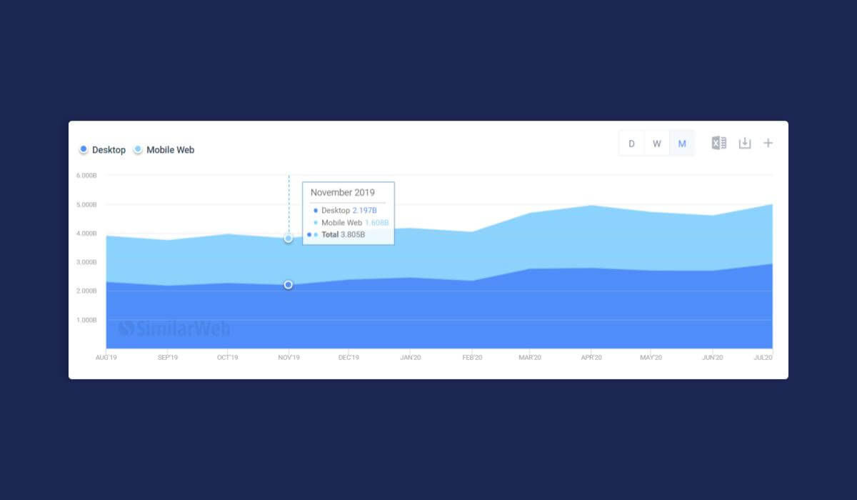 - Moyenne de toutes les catégories sur Internet (juillet 2020) : ordinateur 48,92% ; Web mobile 51,08%