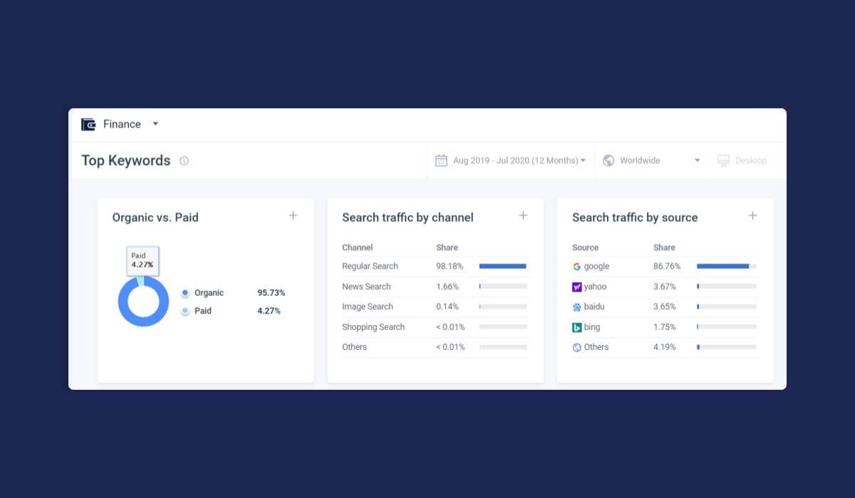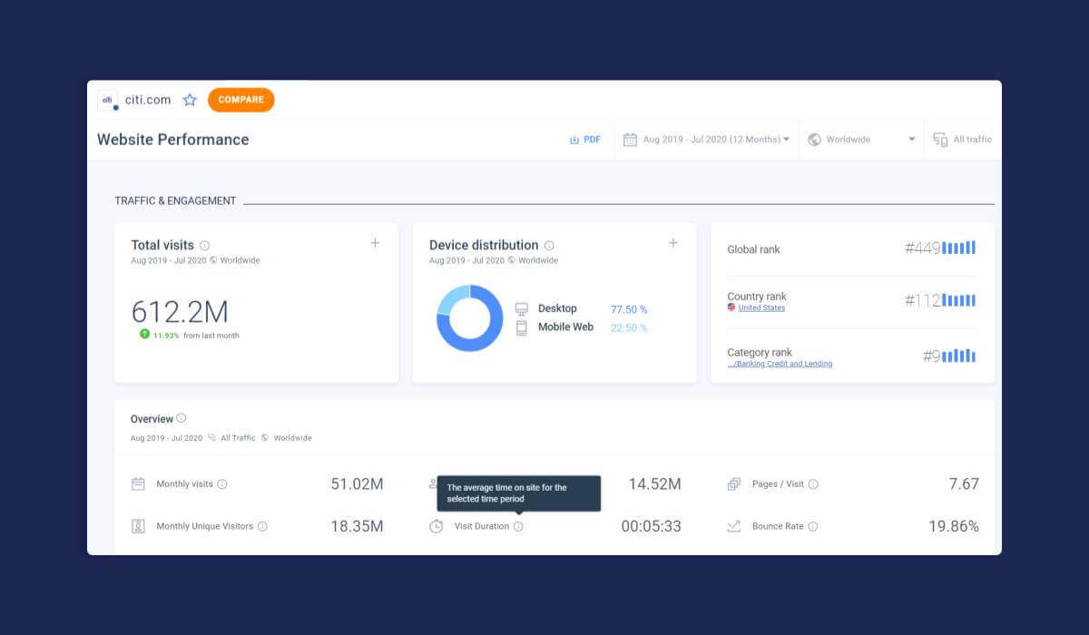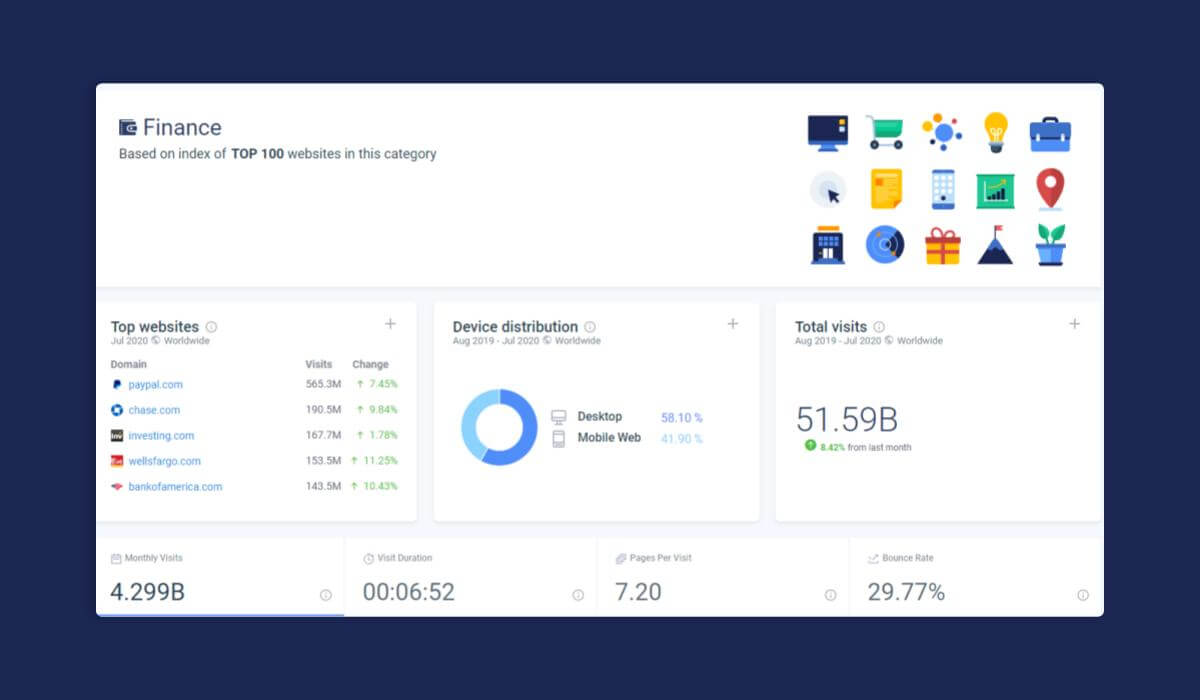 Pour vous aider à être plus efficace, nous avons créé un benchmark finance, une compilation de références de sites Web qui compare la catégorie Finance à toutes les autres catégories de Similarweb PRO et met en évidence les différences d’utilisation entre les différents segments financiers.