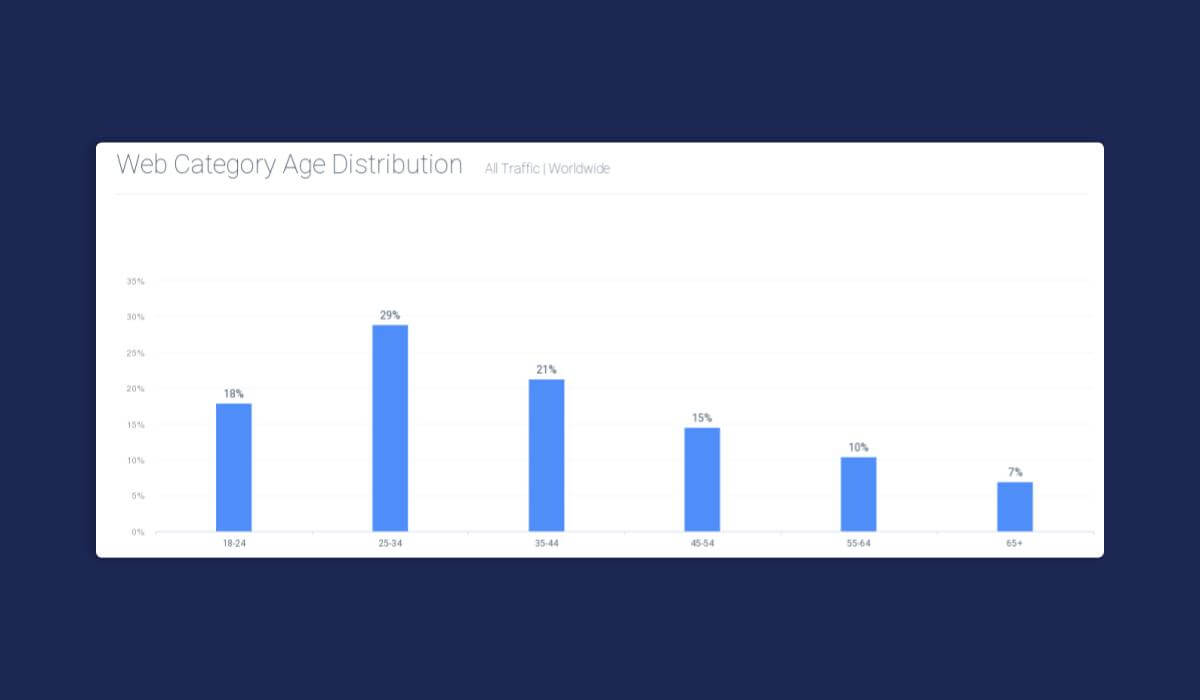 Avoir accès aux données démographiques de vos visiteurs est crucial pour élaborer votre stratégie de contenu. Cette donnée peut vous donner des informations précieuses sur le fonctionnement du contenu de votre entreprise et sur les domaines dans lesquels vous devez doubler vos efforts marketing. Par exemple, et comme le montre le graphique ci-dessous, si vous ne ciblez pas déjà les jeunes consommateurs, vous devriez le faire. Avec une moyenne de 29%, les 23-34 ans sont les plus gros utilisateurs de services financiers au monde.