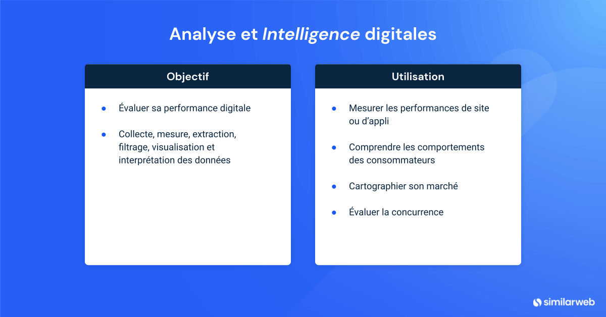 Pour l’heure, concentrons-nous sur l’utilisation de la Digital Research Intelligence de Similarweb, afin de vous permettre de mieux connaître votre audience et développer votre entreprise. Nous étudierons ce que signifie l’analyse numérique aujourd’hui, pourquoi elle est essentielle et comment en bénéficier au maximum.