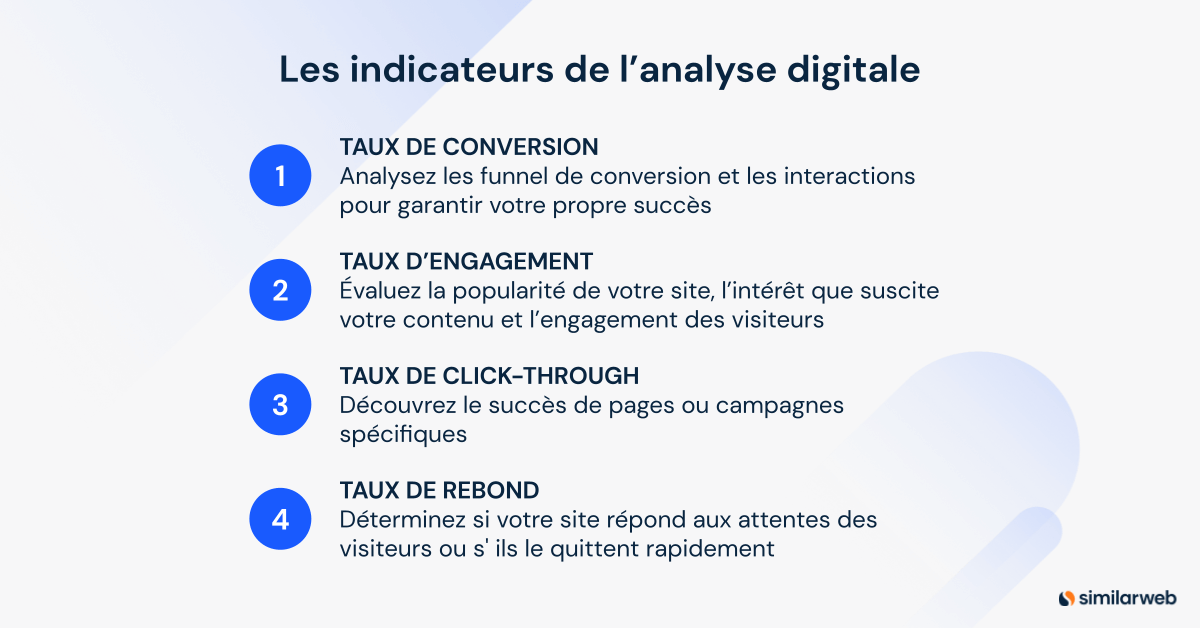 Le type de données que vous choisissez d’analyser dépend de ce que vous souhaitez savoir. Vous pouvez être très précis dans vos analyses numériques en approfondissant différents indicateurs, il vous suffit de savoir quoi rechercher.