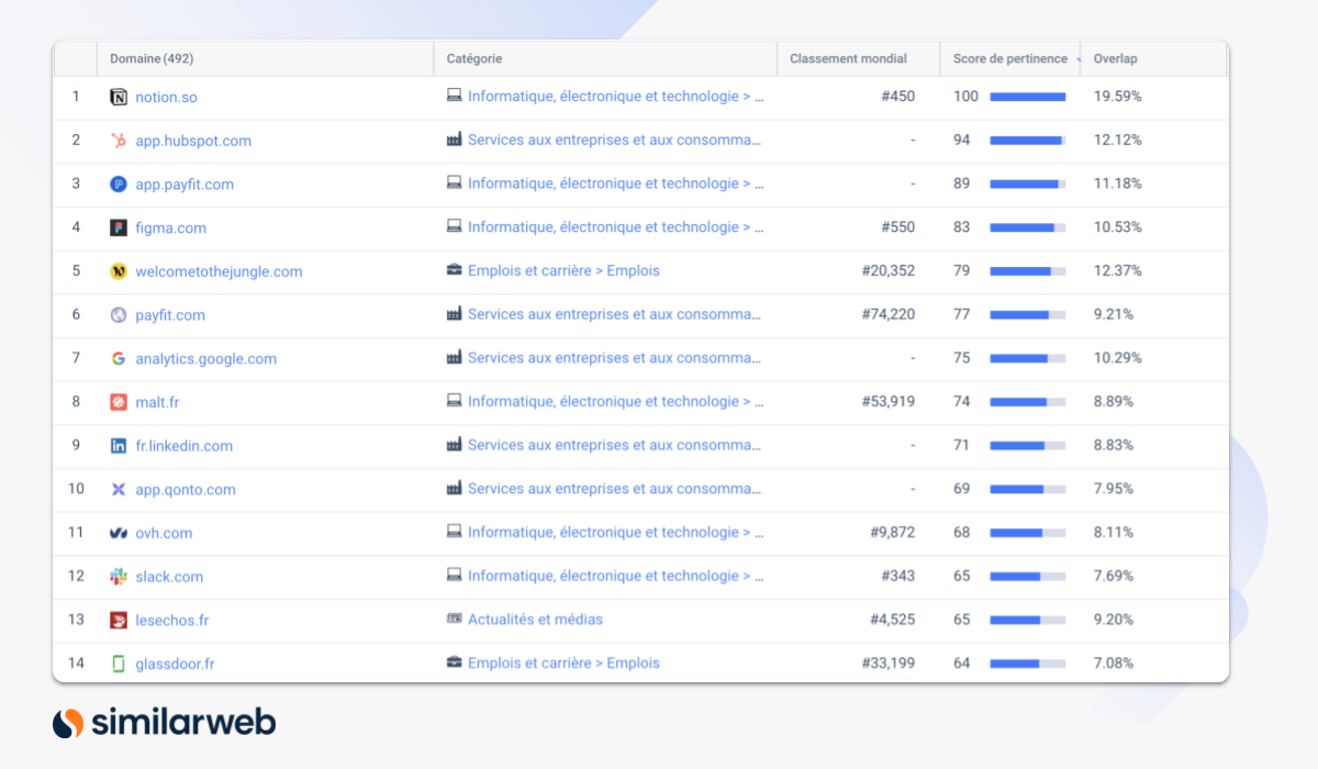 L’analyse approfondie d’Alan révèle une audience particulièrement friande de services numériques à destination des professionnels : Notion, Hubspot, Payfit, Figma, WTTJ, Slack… mais aucune assurance concurrente !