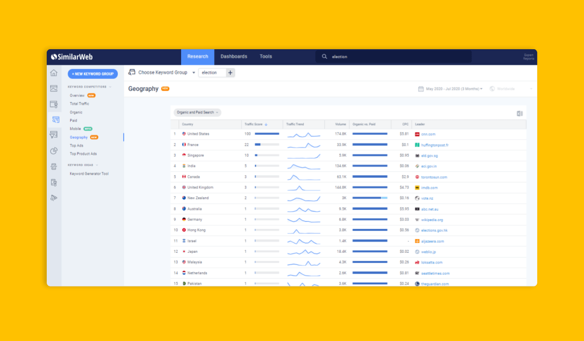 La page Géographie de mots-clés détaille le mot-clé ou groupe de mots-clés sélectionné pour vous aider à concentrer vos efforts en termes de stratégies d’acquisition potentielle de nouveaux marchés. Vous trouverez ci-dessous les principaux pays qui reçoivent du trafic du mot-clé « election ».