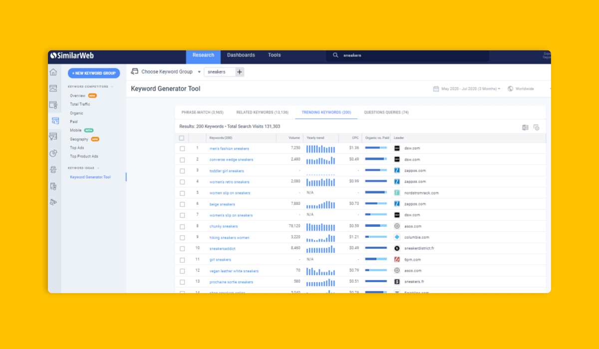 Grâce à toutes ces améliorations de la fonctionnalité de recherche de mots-clés, nos clients peuvent dorénavant comprendre précisément et en toute confiance l’écosystème des mots-clés (qu’il s’agisse du classement géographique ou des leaders de mots-clés), de comprendre les tendances de mots-clés ou de développer leurs listes de mots-clés de longue traîne. Similarweb offre une expérience de recherche de mots-clés inégalée.