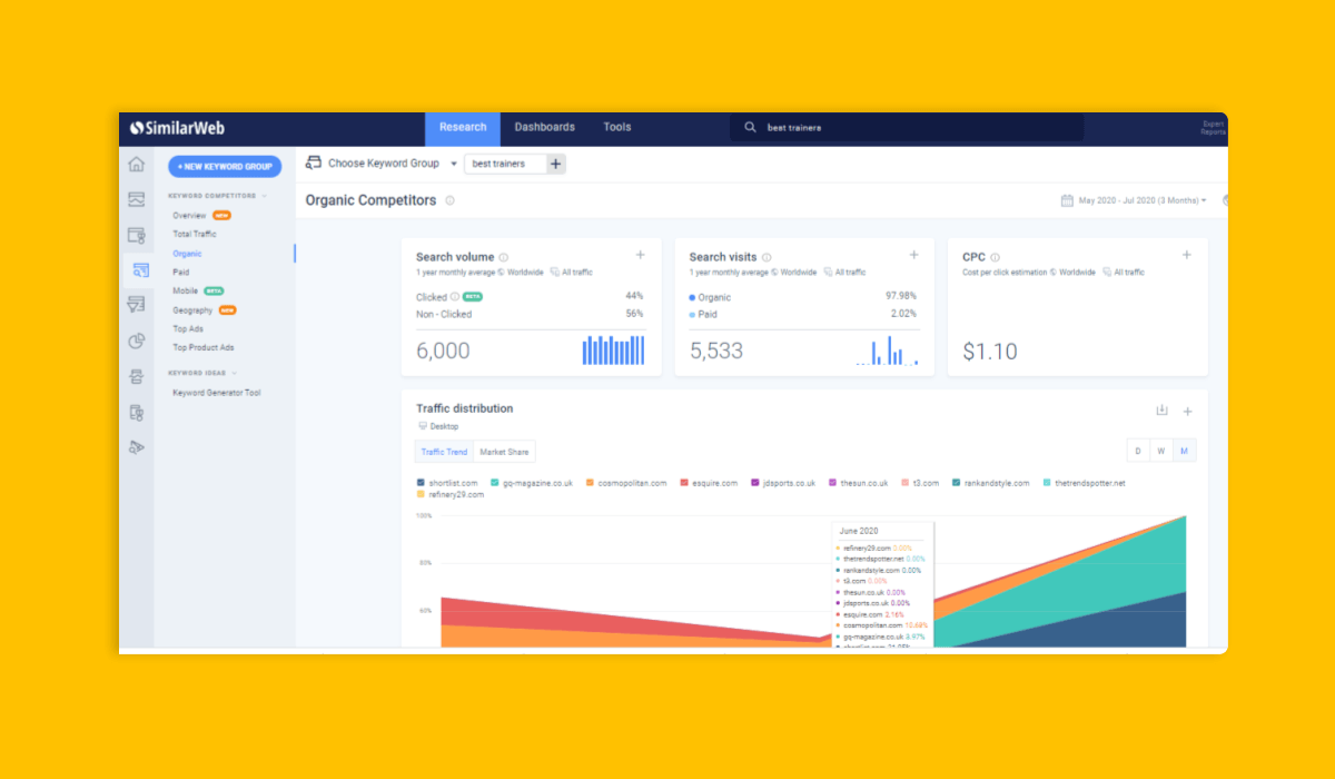 L’indicateur zéro-clic de Similarweb, lancé en mars dernier, vous permet d’optimiser la stratégie SEO et PPC des mots-clés qui génèrent des visites et de l’engagement sur le site. Si le trafic est votre objectif principal, hiérarchisez les mots-clés ayant des taux de clics élevés (CTR). Vous trouverez ci-dessous l’aperçu des clics et des non-clics pour le terme de recherche « best trainers ».