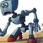 Image: “robot in a foot race pauses to catch its breath, cartoon” by the Bing Image Generator