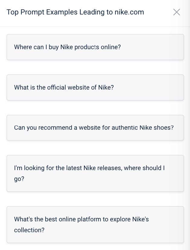 nike.comに着地したユーザーの生成AIへの質問を確認することもできます。公式サイトから購入したい、最新作を探している、コレクションしているなど、どのような興味関心からサイトに着地しているかを知ることができます。