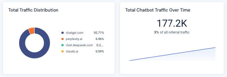 2025年2月時点の調査によると、Nike、Adidas、New Balance、Foot Locker、HOKAなどのブランドサイトには、月間177,200件のチャットボット由来のトラフィックが発生しており、全リファラルの3%を占めています。