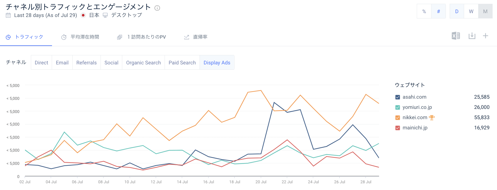 スポーツ用品サイトだけでなく、Nikkei.comのようなニュースサイトでも、東京で開催されるスポーツイベントに関連したビジュアルによって、ディスプレイ広告からのトラフィックの割合が大幅に増加しています。その中で、朝日新聞社は、Sportsbull.jpなどのスポーツ系サイトや、開会式のテーマ曲が話題になったニュースを扱うサイトからの訪問者を活用し、ディスプレイ広告のインバウンドを大きく伸ばすことができました。