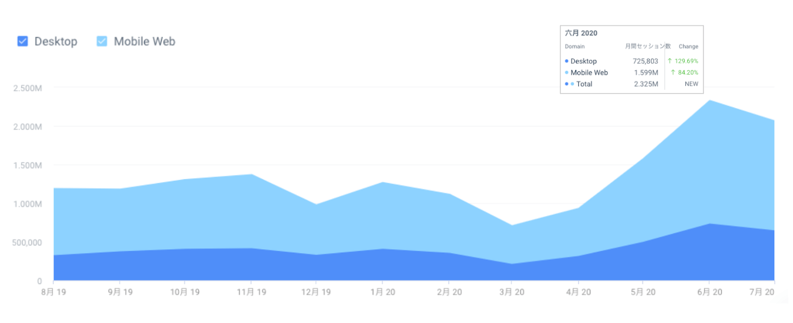 日本国内での、直近12ヶ月のトラフィック推移を見てみると、4月以降、上昇傾向にあることが分かります。そして5月から6月にかけて大幅に数字を伸ばしており、デスクトップは6月は前月と比較して129.69%、モバイルは6月には前月比84.20%の伸びとなっています。また、モバイルからの流入が多いのも大きな特徴です。