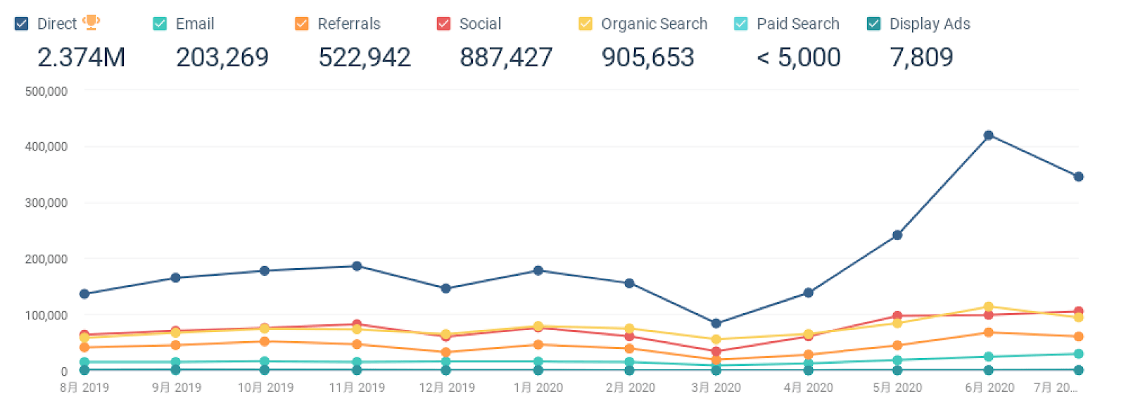2番目に流入数の多い、オーガニック検索の動きを掘り下げてみましょう。期間は、トラフィックが増え始めた2020年4月から7月までの4ヶ月で絞り込んでみました。