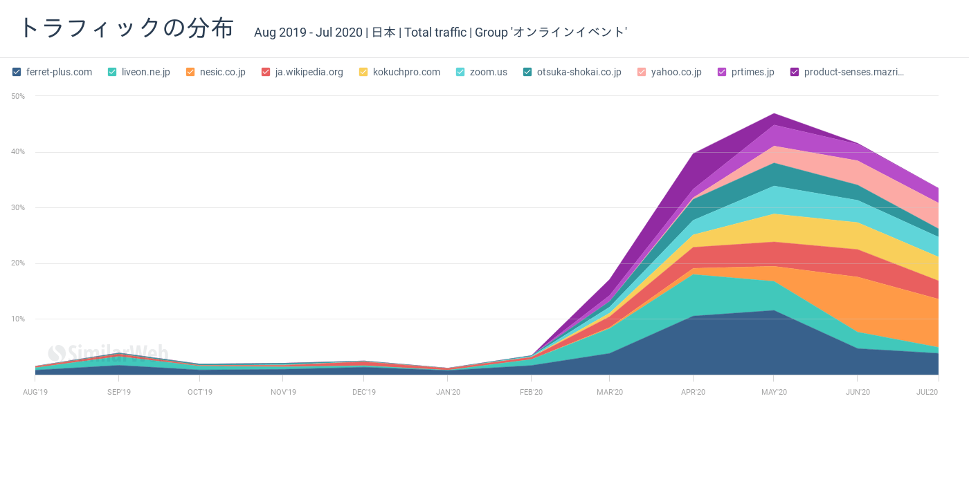 どうやら、オフラインイベントを開催するのはまだまだ難しそう、ということから、オンラインイベントに活路を見出そうとする事業者が増え、その結果として peatix.com へのトラフィックが増えてきたのではないかと仮説立てることができます。