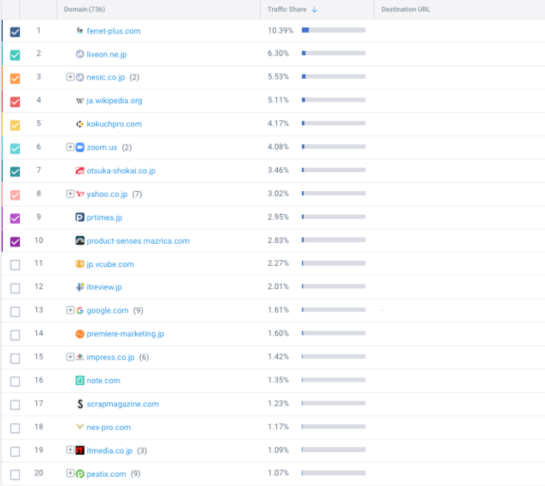 トラフィックを獲得しているサイトを細かく見てみると、ニュースメディアやオウンドメディアなど、記事コンテンツ系サイトが上位に並び、今回のキーワード調査の起点となった peatix.com は20位となっています。各ドメインの横にある [Destination URL] セクションからは、各ドメインで「オンラインイベント」というキーワードグループから1番多くのトラフィックを獲得したページを確認することができますが、多くは「オンラインイベント・オンラインセミナーの開催方法」「オンライン会議とオンラインセミナーの違い」「オンラインイベントとリアルイベントの違い」といった、How To系のコンテンツとなっています。
