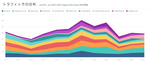 「NISA」を含む関連キーワードから流入のある上位100ウェブサイトで、全体の96%の訪問数を占めています(2019年7月〜2020年6月)。その内訳を見ると、メディアが約54%、証券会社が約21%、金融庁が約9%、銀行が約4%、アセットマネジメントが約2%となっています。実際にNISA口座を取り扱う証券会社や銀行は、競合他社だけでなく圧倒的なシェアを誇るメディアに対してもSEOやコンテンツマーケティングで戦わないといけないことが分かります。