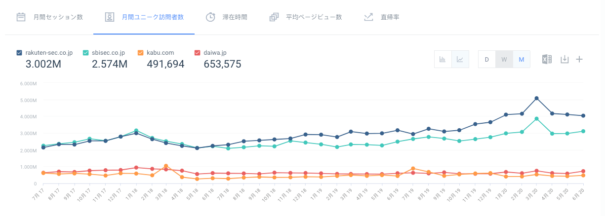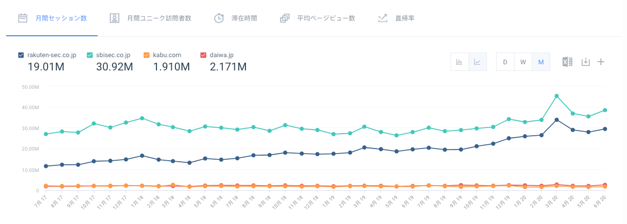 楽天証券が2020年3月に発表したプレスリリースによると、総合口座数はSBI証券が500万口座に対して楽天証券400万口座と、まだSBI証券の方が多いようです。しかし、Similarweb上の月間ユニーク訪問者数では2018年7月以降は楽天証券がSBI証券を越えています。実際の口座数とウェブ上のユニーク訪問数はリンクしていないことが分かります。このことから、SBI証券は実際にログインするアクティブユーザーの割合は高くないのかもしれません。
