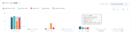 その要因を探るため、競合他社と流入チャネルで比較してみます。NISA関連キーワードからの流入の多かったSBI証券、auカブコム証券、大和証券と並べて分析します。
