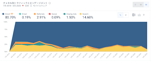 そのオーガニック検索をさらに細かく見ていきます。オーガニック検索トラフィックの昨対比(2018年7月-2019年6月 vs 2019年7月-2020年6月)は、138.32%でした。一方、サイト全体つまり全チャネル合計の訪問数の昨対比は138.94%でした。つまり、オーガニック検索は全体の流入における貢献が昨対比と変わらないことが分かります。モバイルのチャネルを分析しても、オーガニック検索のシェアが増えているわけではなく、むしろダイレクトの流入の割合が増えていることが分かります。