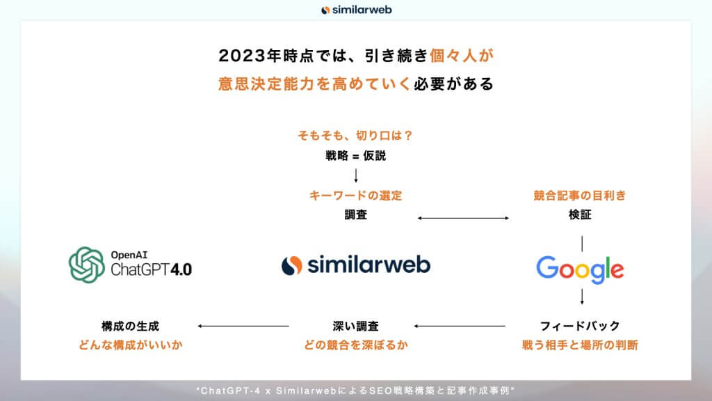 時は流れ2023年。ChatGPT-4の誕生により、SEOの実務に「ChatGPT-4 x Similarweb」という“機械の力”が入ることにより、“人の力”の課題を大きく改善しました。