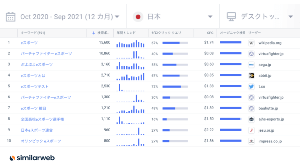 日本での検索キーワードを分析すると、一般的に正確な単語(eスポーツ)を検索する人は主にウィキペディアに着地し、このトレンドについて知る可能性が高いことがわかりました。また、「eスポーツとは」が4番目に多く検索され、多くの消費者がビジネス系メディアサイトであるSBBIT.jpにアクセスしています。