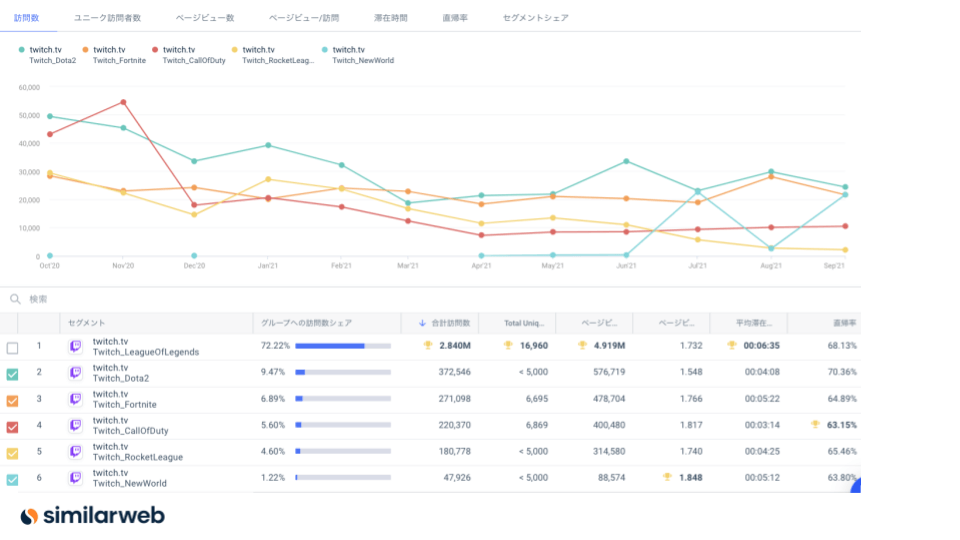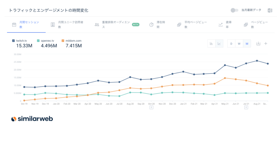 一方、Twitchへの日本におけるトラフィックはこの2年間で3桁成長しており、2019年10月には1,000万未満だった訪問数は、が、2021年9月には2,500万近くと2倍以上の伸びとなっています。