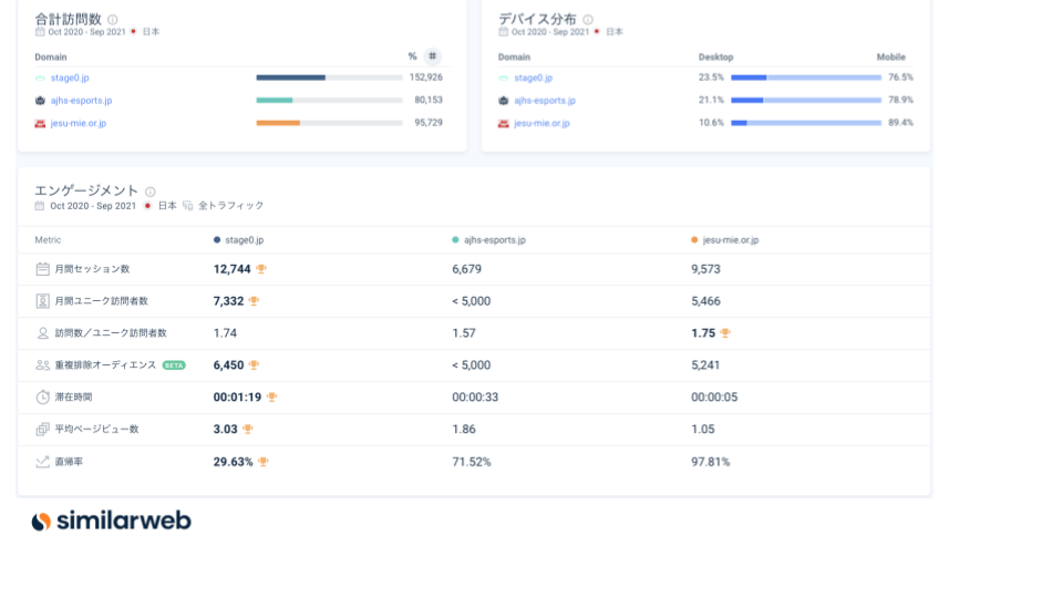 ご存知の通り、eスポーツの世界には、プラットフォーマーからインフラ、メディアまで様々なプレーヤーが存在します。シミラーウェブはそれぞれのデジタル上のトレンドを、世界や国のレベルで把握することが可能です。