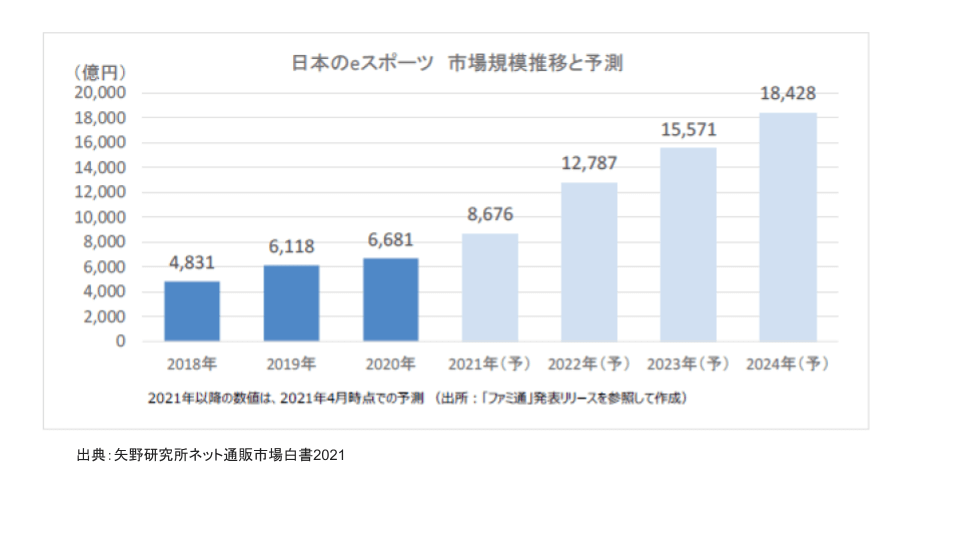 矢野経済研究所の調べでは、日本国内でも今後eスポーツの市場規模が伸びていく事を予測しており、下記図の通り2018年から2020年には約140%の伸びを見せています。