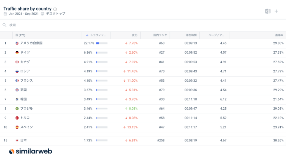 日本はビデオゲームの生産・販売国としては最大級であるにもかかわらず、eスポーツに関する国内の認知度は人口の50%強にとどまっており(Nippon.com)、このことは、世界最大のゲームに特化した動画配信サービスであるTwitchへのアクセス数を見ても確認できます。日本からのトラフィックシェアは15位にとどまっており、2021年1月以降の合計訪問者数の2%にも満たないのです。