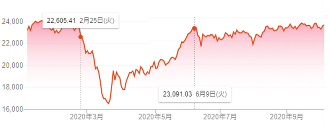 xコロナ禍における日経平均株価の顕著な下落開始時期を、2020年2月25日と設定します。終値は22,605円。(2月24日は祝日、前週末の終値23,386円から約4.4%の下落した時点を起点とします)最下落地点を2020年3月19日、終値は16,552円と設定します。そこから上昇に転じ、2020年6月9日を一旦の回復日と設定します。終値は23,178円でした。x