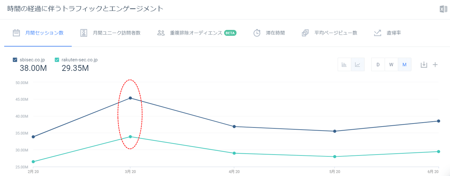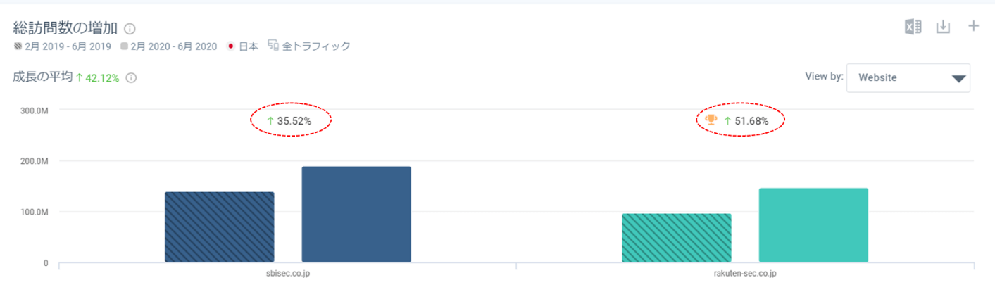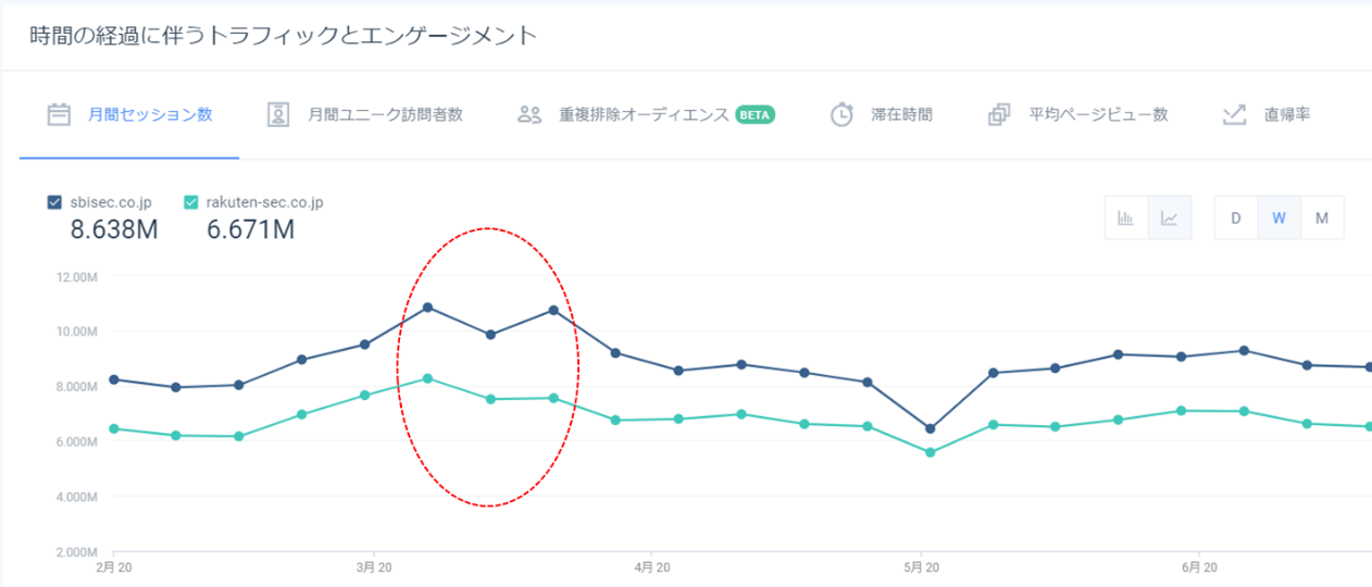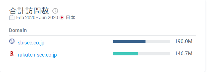 xこの期間の、インターネット専業証券会社であります、株式会社SBI証券、楽天証券株式会社2社におけるデータを分析してみます。仕様上、データ抽出期間を2020年2月~6月とします。以下は、該当期間中の合計訪問数のデータです。更にシミラーウェブ PROの分析機能により、各サイトに訪問しているユーザーの約80%がログイン(=口座を開設している)してる事も分析できました。x