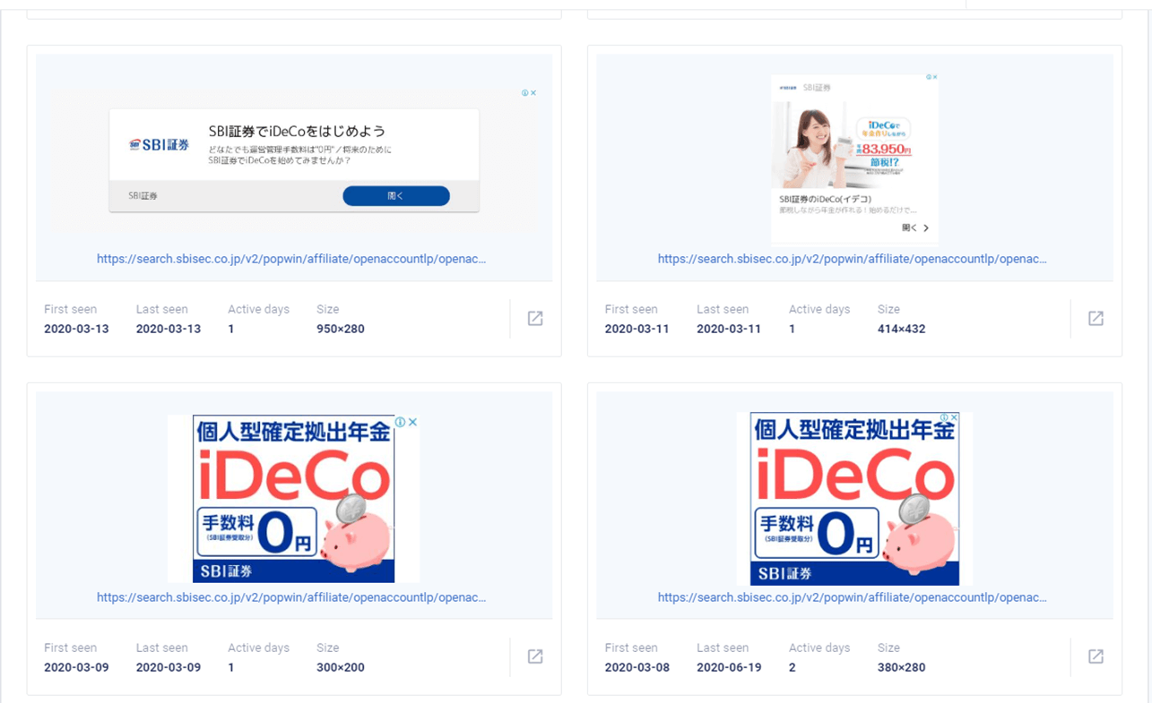 x滞在時間の長い=投資に対して情報収集意欲の高いユーザーが誘導されたとも仮説付けられます。では、実際にSBI証券のディスプレイ広告がどのようなクリエイティブであったかをシミラーウェブ PROのデータで見てみましょう。x