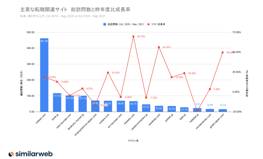 転職サイトトップ15の総訪問数と変化率(成長率)