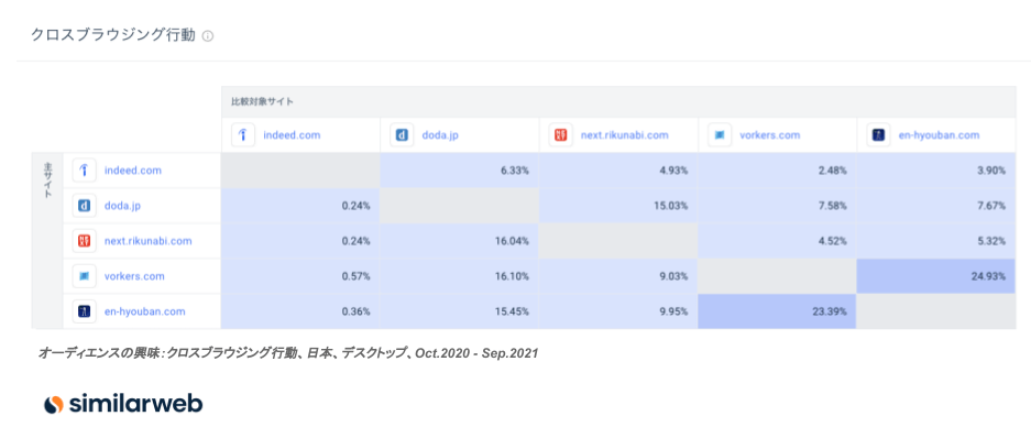 そしてもうひとつ、これら4サイトにおけるクロスブラウジング行動(同日中に他のサイトを訪問している割合)を見ると、下記の通り転職サイトと口コミサイトの重複訪問の割合が10%前後であるのに対して、口コミサイト同士ではその割合は24%と非常に高い重複率となっています。