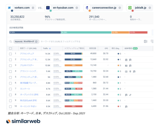 ここでは、求職者が就職したい企業ランキングで常に上位にくる総合商社の伊藤忠商事を例に見てみます。上記手順にしたがって作成した伊藤忠商事を含む検索キーワードのキーワードグループに対する着地サイトが下記の画面です。左からデスクトップのオーガニック検索、デスクトップの有料検索、モバイル検索のそれぞれの着地サイトのトップ5です。伊藤忠商事の公式サイトはデスクトップでは1位をとっていますが、モバイルでは残念ながら2番目となってしまっています。また今回焦点をあてたvorkers.comのほか、就活サイトやニュースメディア、企業関連情報を提供するメディアサイトが上位に顔を出していることがわかります。