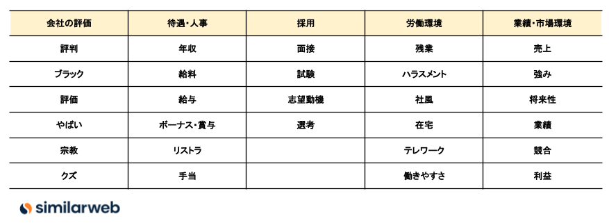 そこで、企業名を除外したキーワードの中で訪問数が多いものをピックアップして整理したところ、下記のように5つのカテゴリにまとめることができました。各カテゴリの代表的なキーワードを抜粋しましたが、いずれも求職者が求めている情報であることがよくわかります。