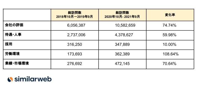 訪問数のボリュームと変化率からは、やはり会社への評価に対する関心が最も高いことがわかりますが、大きく成長しているのは労働環境カテゴリです。2年前と比較して2倍に拡大し、採用カテゴリの数字を抜き去っています。特に訪問数が大きく伸びているキーワードをピックアップすると、労働環境カテゴリでは、社風188%、テレワーク837%、リモート650%、ワークライフバランス138%などとなっています。また業績・市場環境では、将来性204%、競合263%などが目立ちます。