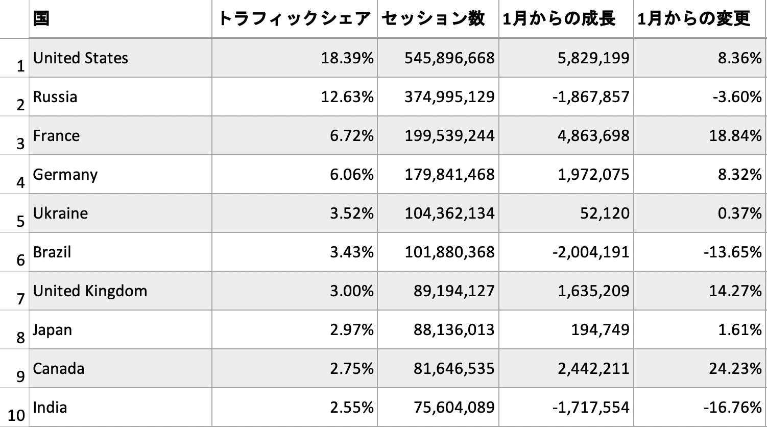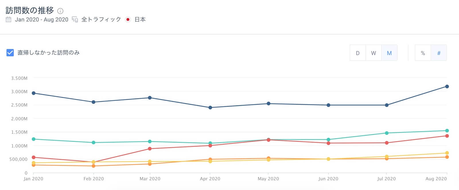 x日本は8番目にトラフィックシェアが大きく、上位に位置していることがわかります。(2020年1月〜8月のデータに基づく)新型コロナウイルスの感染者数が多い国では年始からの成長率が大きい事が見受けられますが、海外に比較して感染者数を抑えている日本国内でもこのカテゴリー内でのトラフィックボリュームが伸びている事がわかります。x