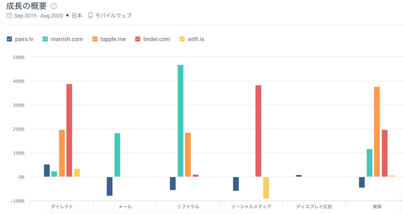 xまた、以下の成長の概要から、各サイトがどの流入チャネルを最も強化しているのか、一年の成長率を見ることで確認する事ができます。これを見ると、Tinderはマッチングアプリ内でも最も主要チャネルになるダイレクトの訪問の他に、ソーシャルからの流入に力を入れた事がわかります。また昨年はTinderが大々的に都心部で屋外広告を出していたことから、知名度があり、指名でブランドの検索にも影響したと予測できます。x
