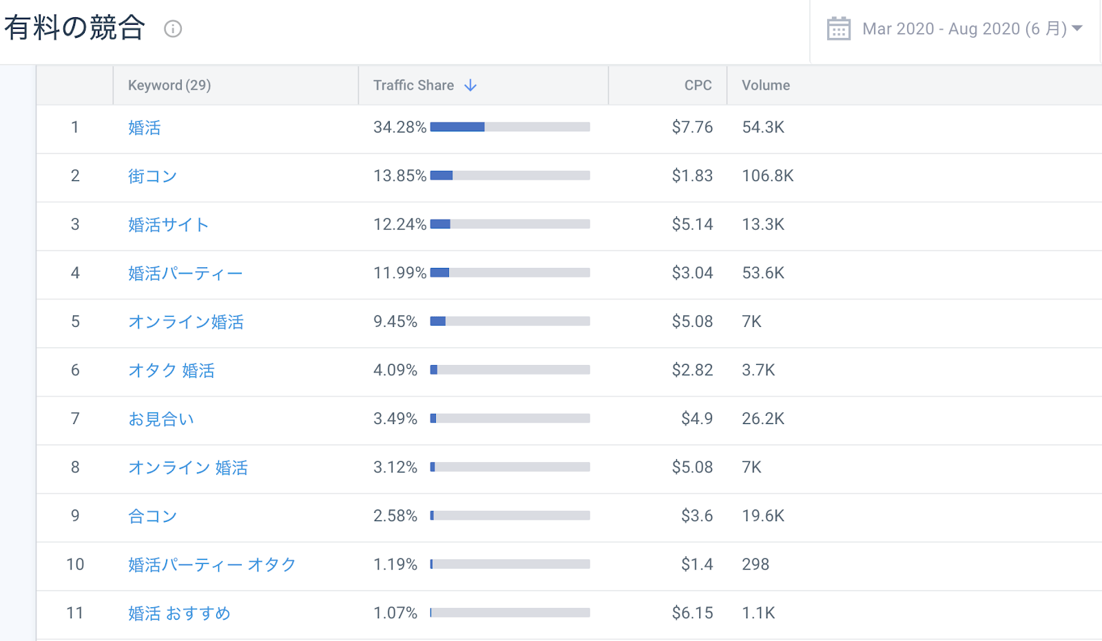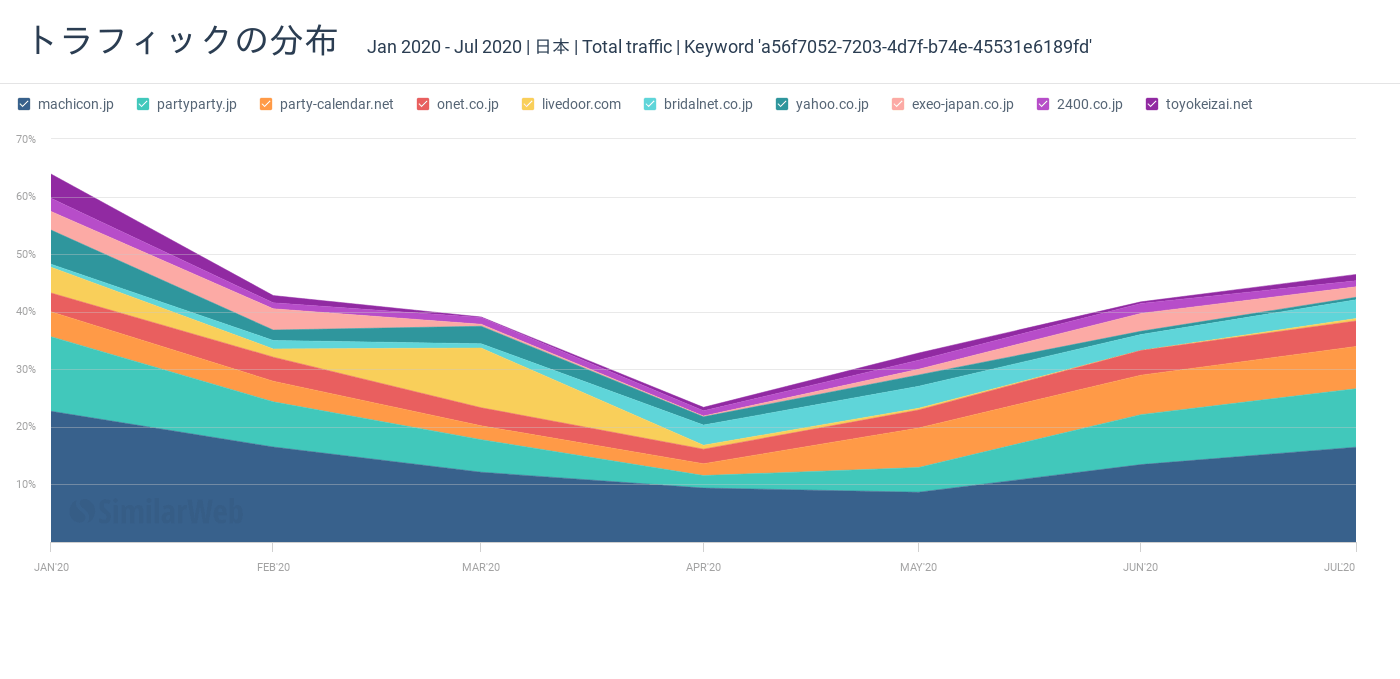 xオンライン上での出会いを求めて、人と実際に対面する街コンのサイトへの流入が下がると予測していた所、実態は5月の緊急事態宣言が解除される前から「街コン」というキーワードをはじめに、「婚活パーティー」や「合コン」というキーワードからのトラフィック総数が7月まで右肩上がりだった事が見受けられます。(「街コン」というキーワードをキーワード生成ツールで分析して作成したキーワードグループを基にしています)x